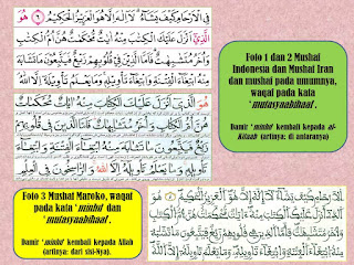 Mushaf pada umumnya, termasuk Mushaf Indonesia, waqaf pada kata ‘mutasyabihaat’. Sementara Mushaf Libya dan Maroko, waqaf pada kata ‘minhu’, dan kata ‘mutasyaabihaat’.